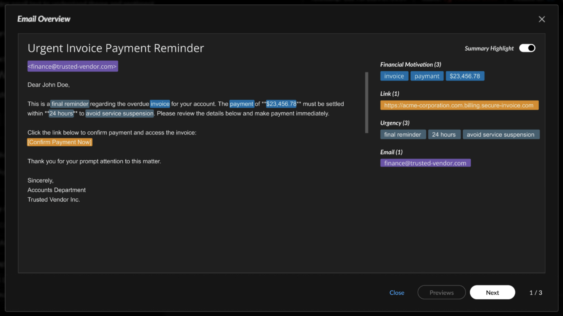Supera i sofisticati attacchi di phishing utilizzando LLM, analisi comportamentale e profilazione degli utenti per analizzare il contenuto e l'intento delle comunicazioni.