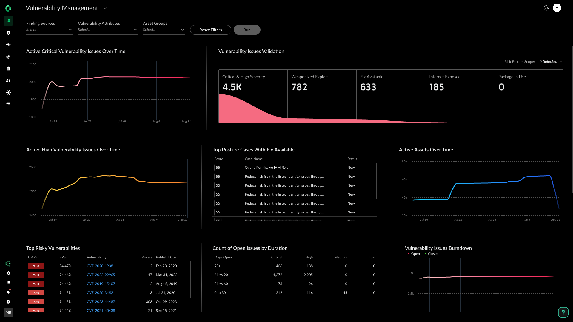 Assegna le priorità ai rischi e riduci l'affaticamento dovuto al volume di avvisi facendo emergere le vulnerabilità critiche, utilizzando fattori di rischio correlati come esposizione esterna, autorizzazioni eccessive, configurazioni errate, dati sensibili, segreti e malware.
